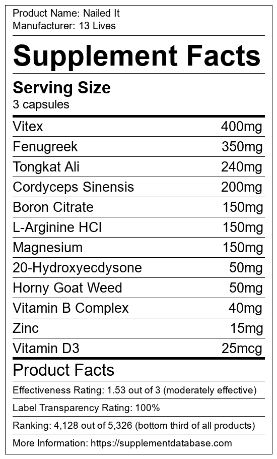 Nailed It is a mood enhancing supplement manufactured by 13 Lives. It ranks 37 out of 43 mood enhancing supplements and earned an overall thumbs-down recommendation based on seven factors including nutrition label transparency, ingredients, dosing, claims, research rating, and ranking.