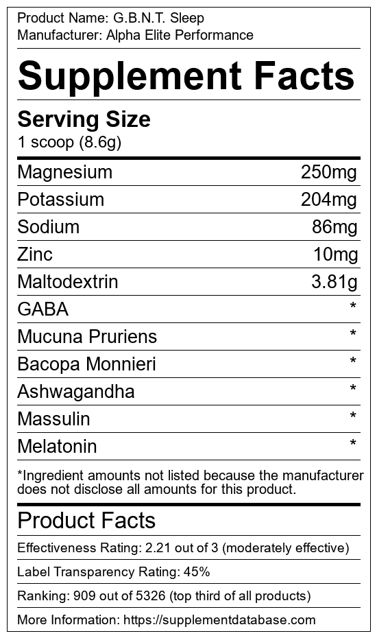 G.B.N.T. Sleep is a sleep aid manufactured by Alpha Elite Performance. It ranks 85 out of 215 sleep aids and earned an overall thumbs-up recommendation based on seven factors including nutrition label transparency, ingredients, dosing, claims, research rating, and ranking.