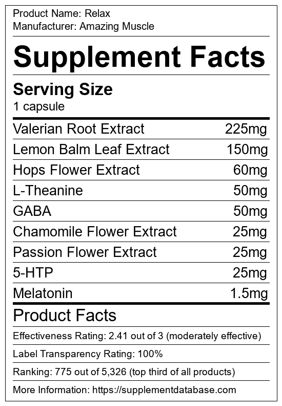 Relax is a sleep aid manufactured by Amazing Muscle. It ranks 55 out of 215 sleep aids and earned an overall thumbs-up recommendation based on seven factors including nutrition label transparency, ingredients, dosing, claims, research rating, and ranking.