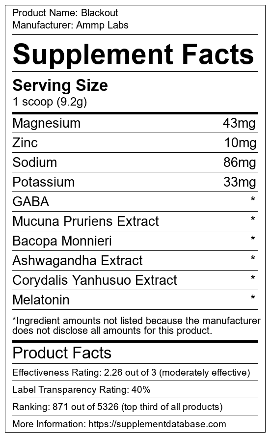 Blackout is a sleep aid manufactured by Ammp Labs. It ranks 78 out of 215 sleep aids and earned an overall thumbs-up recommendation based on seven factors including nutrition label transparency, ingredients, dosing, claims, research rating, and ranking.