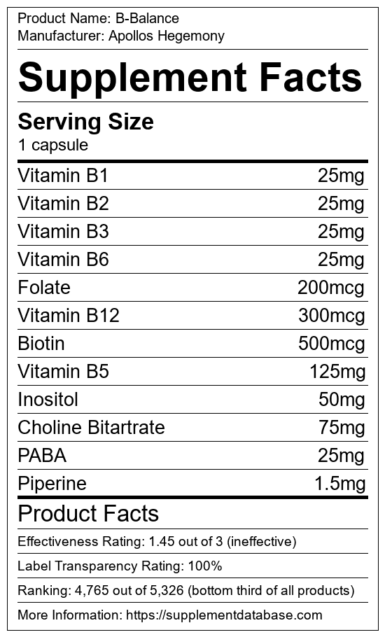 B-Balance is a multivitamin manufactured by Apollos Hegemony. It ranks 50 out of 52 multivitamins and earned an overall thumbs-down recommendation based on seven factors including nutrition label transparency, ingredients, dosing, claims, research rating, and ranking.