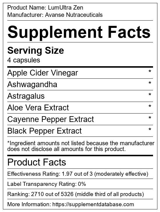 LumUltra Zen does not list ingredient amounts on its label. This makes it impossible to analyze ingredient dosing.