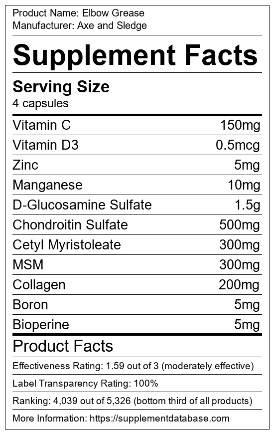 Elbow Grease is a joint supplement manufactured by Axe and Sledge. It ranks 94 out of 99 joint supplements and earned an overall thumbs-down recommendation based on seven factors including nutrition label transparency, ingredients, dosing, claims, research rating, and ranking.