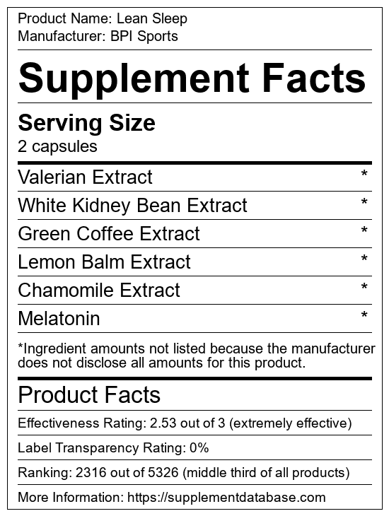Lean Sleep is a sleep aid manufactured by BPI Sports. It ranks 137 out of 215 sleep aids and earned an overall thumbs-down recommendation based on seven factors including nutrition label transparency, ingredients, dosing, claims, research rating, and ranking.