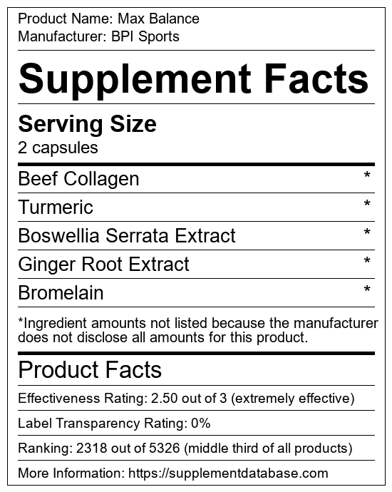 Max Balance is a joint supplement manufactured by BPI Sports. It ranks 45 out of 99 joint supplements and earned an overall thumbs-down recommendation based on seven factors including nutrition label transparency, ingredients, dosing, claims, research rating, and ranking.