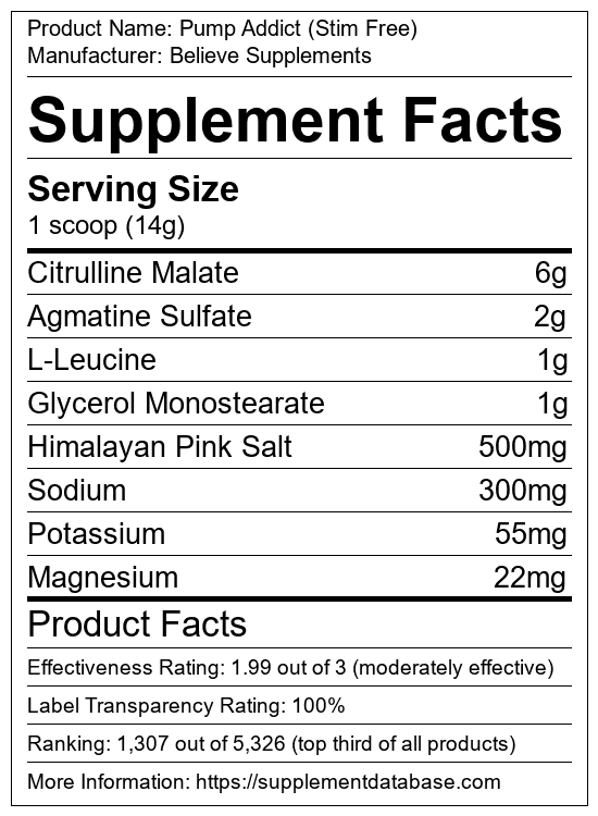 Pump Addict (Stim Free) is a pump supplement manufactured by Believe Supplements. It ranks 124 out of 322 pump supplements and earned an overall thumbs-up recommendation based on seven factors including nutrition label transparency, ingredients, dosing, claims, research rating, and ranking.
