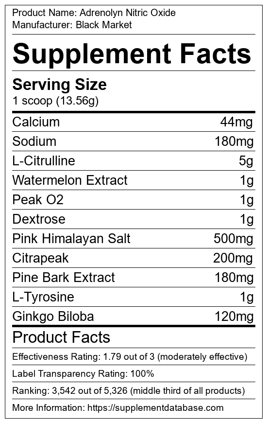 Adrenolyn Nitric Oxide is a pump supplement manufactured by Black Market. It ranks 238 out of 322 pump supplements and earned an overall thumbs-down recommendation based on seven factors including nutrition label transparency, ingredients, dosing, claims, research rating, and ranking.