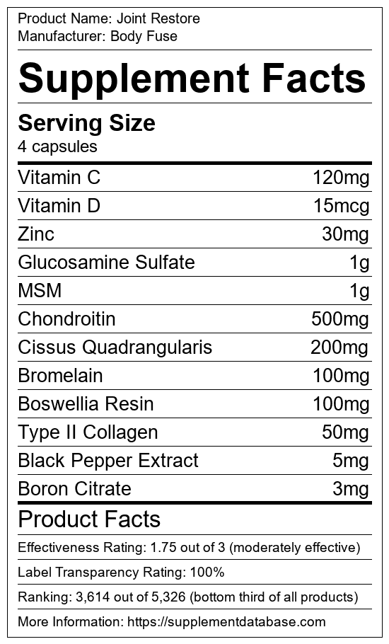 Joint Restore is a joint supplement manufactured by Body Fuse. It ranks 83 out of 99 joint supplements and earned an overall thumbs-down recommendation based on seven factors including nutrition label transparency, ingredients, dosing, claims, research rating, and ranking.