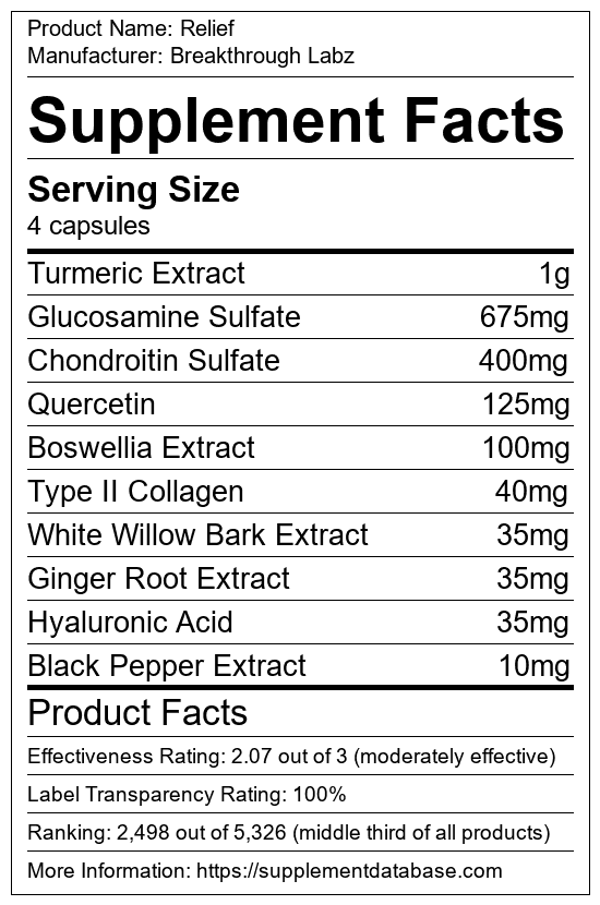 Relief is a joint supplement manufactured by Breakthrough Labz. It ranks 58 out of 99 joint supplements and earned an overall thumbs-down recommendation based on seven factors including nutrition label transparency, ingredients, dosing, claims, research rating, and ranking.