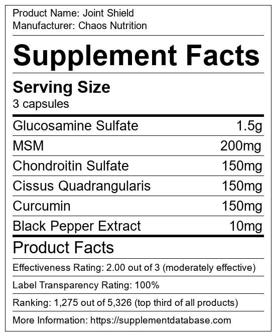 Joint Shield is a joint supplement manufactured by Chaos Nutrition. It ranks 32 out of 99 joint supplements and earned an overall thumbs-up recommendation based on seven factors including nutrition label transparency, ingredients, dosing, claims, research rating, and ranking.