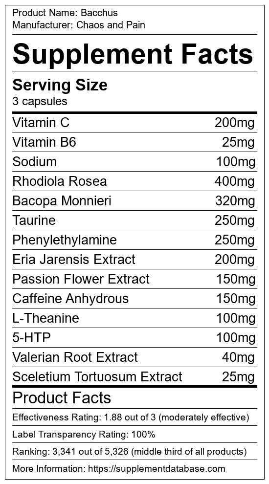 Bacchus is a mood enhancing supplement manufactured by Chaos and Pain. It ranks 31 out of 43 mood enhancing supplements and earned an overall thumbs-down recommendation based on seven factors including nutrition label transparency, ingredients, dosing, claims, research rating, and ranking.