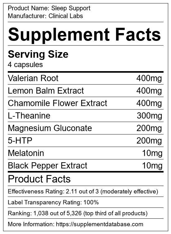 Sleep Support is a sleep aid manufactured by Clinical Labs. It ranks 98 out of 215 sleep aids and earned an overall thumbs-up recommendation based on seven factors including nutrition label transparency, ingredients, dosing, claims, research rating, and ranking.