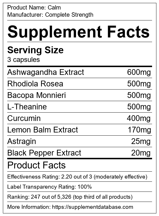 Calm is a mood enhancing supplement manufactured by Complete Strength. It ranks 5 out of 43 mood enhancing supplements and earned an overall thumbs-up recommendation based on seven factors including nutrition label transparency, ingredients, dosing, claims, research rating, and ranking.