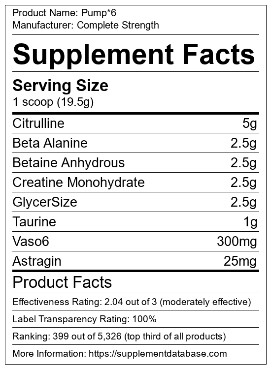 Pump is a pump supplement manufactured by Complete Strength. It ranks 49 out of 322 pump supplements and earned an overall thumbs-up recommendation based on seven factors including nutrition label transparency, ingredients, dosing, claims, research rating, and ranking.