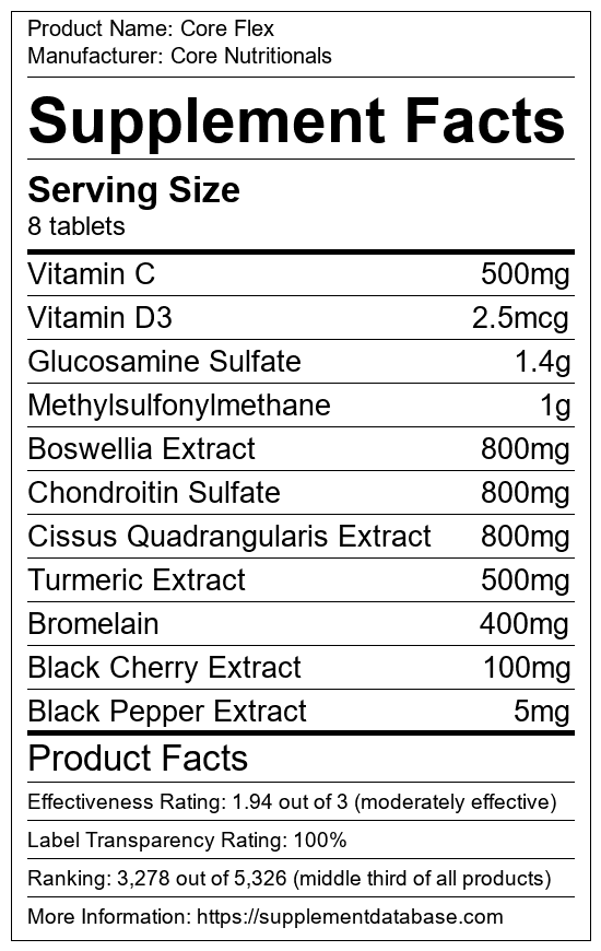 Core Flex ranks 66 out of 99 in the Joint Supplements category and 3,736 out of 5,326 in the entire database. The table below lists comparisons with similarly ranked joint supplement. Click on a link for an in-depth comparison between the two.