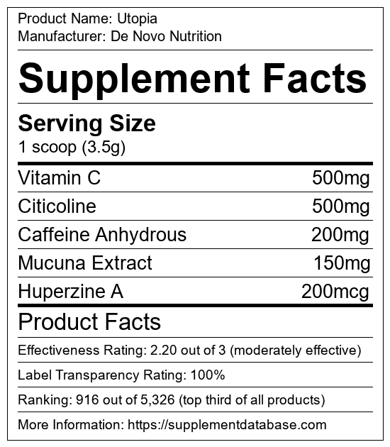 Utopia is a cognitive enhancement supplement manufactured by De Novo Nutrition. It ranks 30 out of 173 cognitive enhancement supplements and earned an overall thumbs-up recommendation based on seven factors including nutrition label transparency, ingredients, dosing, claims, research rating, and ranking.