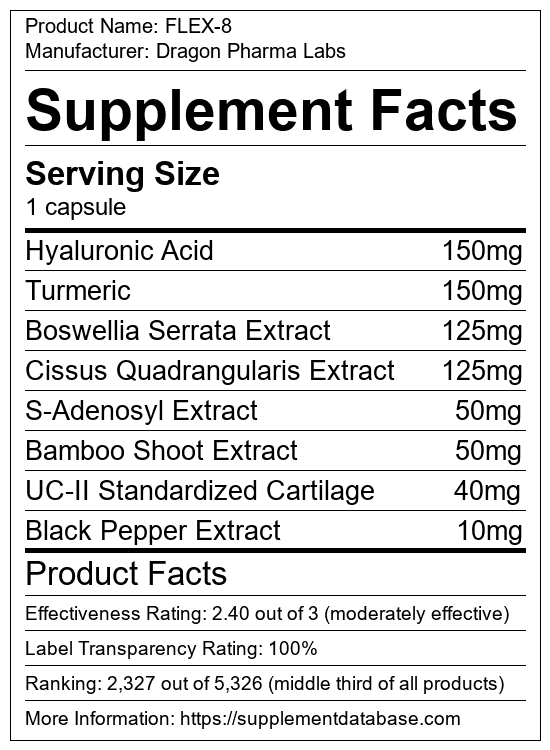 FLEX-8 is a joint supplement manufactured by Dragon Pharma Labs. It ranks 46 out of 99 joint supplements and earned an overall thumbs-down recommendation based on seven factors including nutrition label transparency, ingredients, dosing, claims, research rating, and ranking.