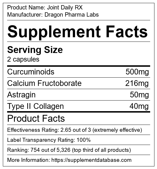 Joint Daily RX is a joint supplement manufactured by Dragon Pharma Labs. It ranks 22 out of 99 joint supplements and earned an overall thumbs-up recommendation based on seven factors including nutrition label transparency, ingredients, dosing, claims, research rating, and ranking.