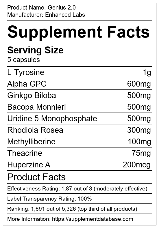 Genius 2.0 is a cognitive enhancement supplement manufactured by Enhanced Labs. It ranks 52 out of 173 cognitive enhancement supplements and earned an overall thumbs-up recommendation based on seven factors including nutrition label transparency, ingredients, dosing, claims, research rating, and ranking.