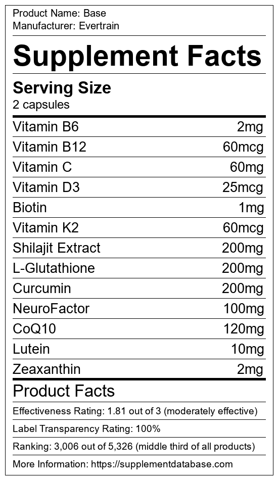 Base is a multivitamin manufactured by Evertrain. It ranks 22 out of 52 multivitamins and earned an overall thumbs-down recommendation based on seven factors including nutrition label transparency, ingredients, dosing, claims, research rating, and ranking.