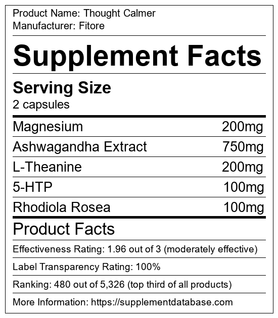 Thought Calmer is a mood enhancing supplement manufactured by Fitore. It ranks 11 out of 43 mood enhancing supplements and earned an overall thumbs-up recommendation based on seven factors including nutrition label transparency, ingredients, dosing, claims, research rating, and ranking.