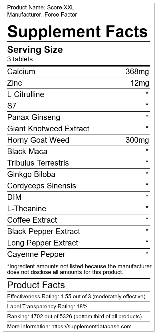 Score XXL is a male enhancement supplement manufactured by Force Factor. It ranks 31 out of 35 male enhancement supplements and earned an overall thumbs-down recommendation based on seven factors including nutrition label transparency, ingredients, dosing, claims, research rating, and ranking.