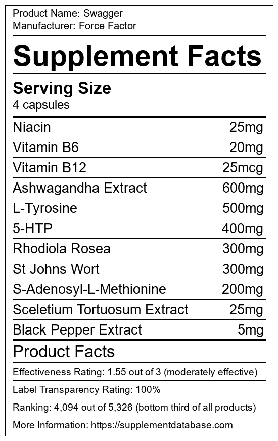 Swagger is a mood enhancing supplement manufactured by Force Factor. It ranks 35 out of 43 mood enhancing supplements and earned an overall thumbs-down recommendation based on seven factors including nutrition label transparency, ingredients, dosing, claims, research rating, and ranking.