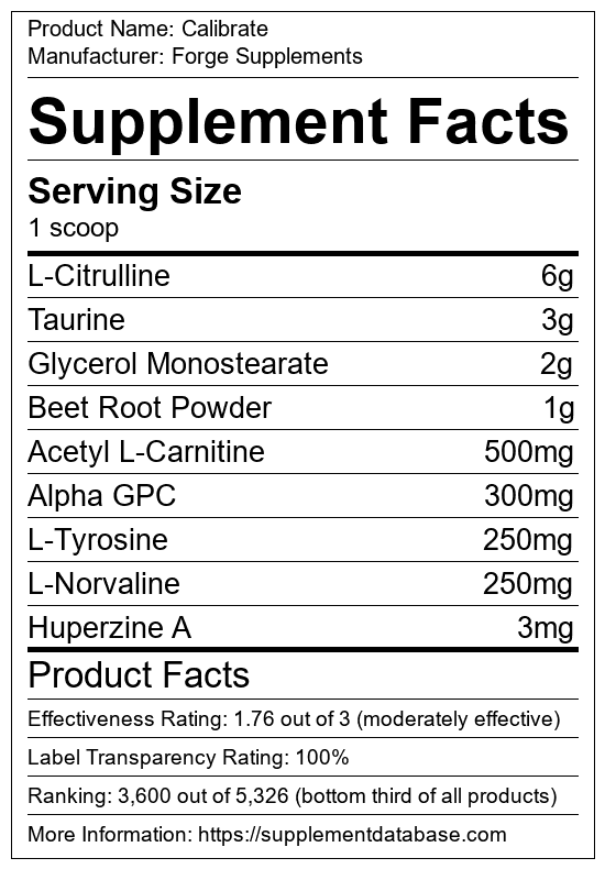Calibrate is a pump supplement manufactured by Forge Supplements. It ranks 248 out of 322 pump supplements and earned an overall thumbs-down recommendation based on seven factors including nutrition label transparency, ingredients, dosing, claims, research rating, and ranking.
