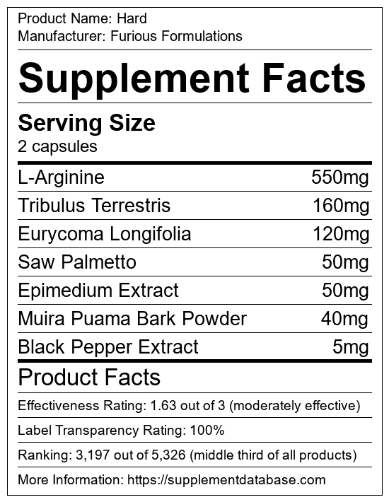 Hard is a male enhancement supplement manufactured by Furious Formulations. It ranks 20 out of 35 male enhancement supplements and earned an overall thumbs-down recommendation based on seven factors including nutrition label transparency, ingredients, dosing, claims, research rating, and ranking.