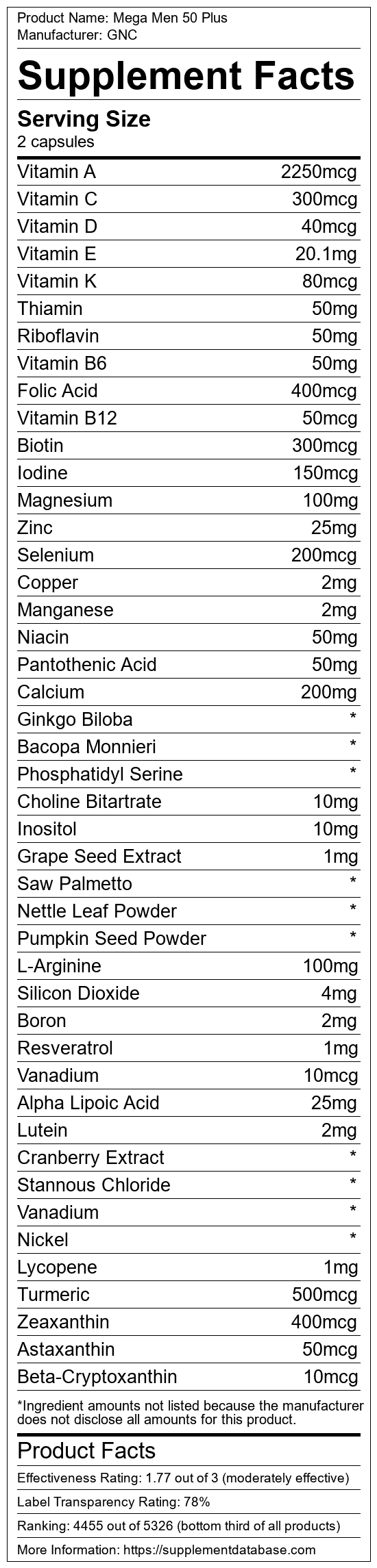 Mega Men 50 Plus is a multivitamin manufactured by GNC. It ranks 45 out of 52 multivitamins and earned an overall thumbs-down recommendation based on seven factors including nutrition label transparency, ingredients, dosing, claims, research rating, and ranking.