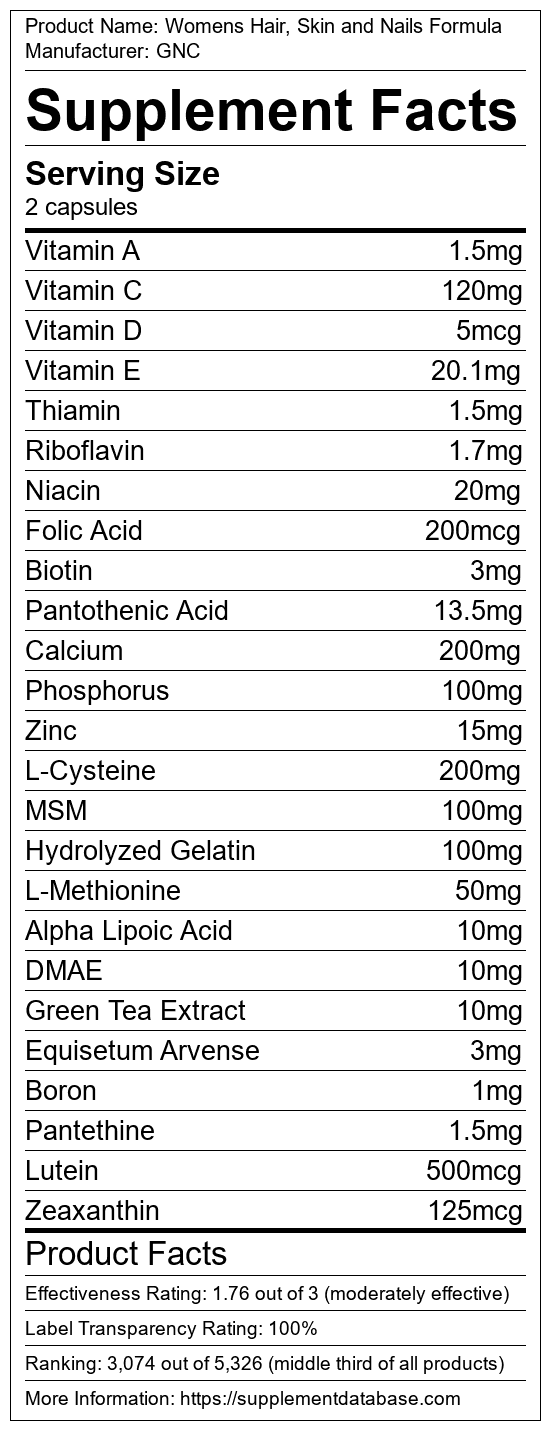 Womens Hair, Skin and Nails Formula is a multivitamin manufactured by GNC. It ranks 24 out of 52 multivitamins and earned an overall thumbs-down recommendation based on seven factors including nutrition label transparency, ingredients, dosing, claims, research rating, and ranking.