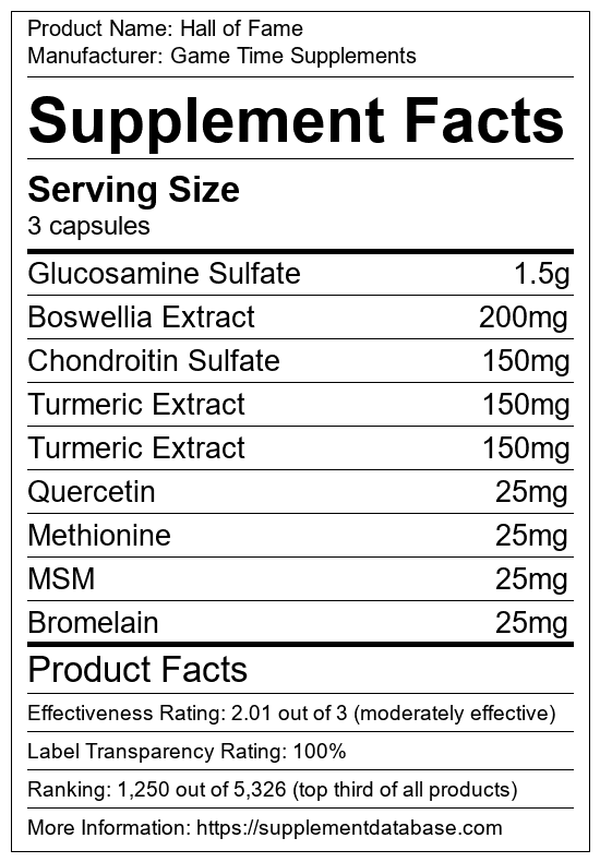 Hall of Fame is a joint supplement manufactured by Game Time Supplements. It ranks 31 out of 99 joint supplements and earned an overall thumbs-up recommendation based on seven factors including nutrition label transparency, ingredients, dosing, claims, research rating, and ranking.