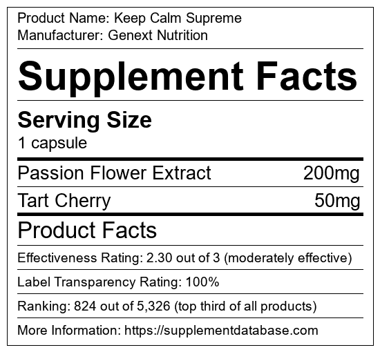 Keep Calm Supreme is a mood enhancing supplement manufactured by Genext Nutrition. It ranks 15 out of 43 mood enhancing supplements and earned an overall thumbs-up recommendation based on seven factors including nutrition label transparency, ingredients, dosing, claims, research rating, and ranking.
