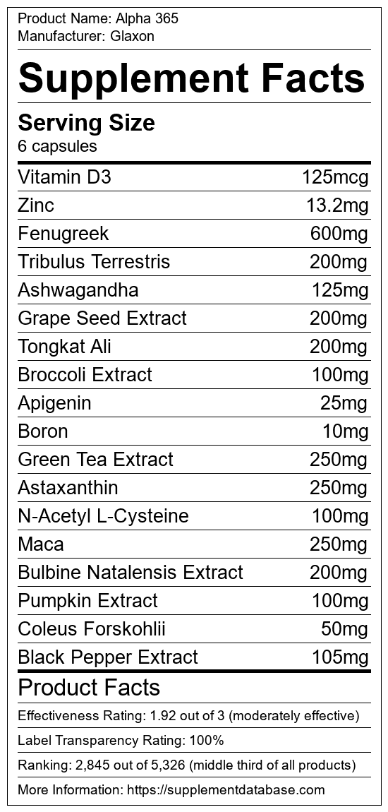 Alpha 365 is a male enhancement supplement manufactured by Glaxon. It ranks 11 out of 35 male enhancement supplements and earned an overall thumbs-down recommendation based on seven factors including nutrition label transparency, ingredients, dosing, claims, research rating, and ranking.