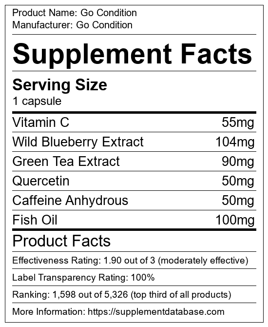 Go Condition is a multivitamin manufactured by Go Condition. It ranks 3 out of 52 multivitamins and earned an overall thumbs-up recommendation based on seven factors including nutrition label transparency, ingredients, dosing, claims, research rating, and ranking.