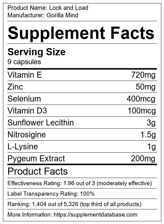 Lock and Load is a male enhancement supplement manufactured by Gorilla Mind. It ranks 6 out of 35 male enhancement supplements and earned an overall thumbs-up recommendation based on seven factors including nutrition label transparency, ingredients, dosing, claims, research rating, and ranking.