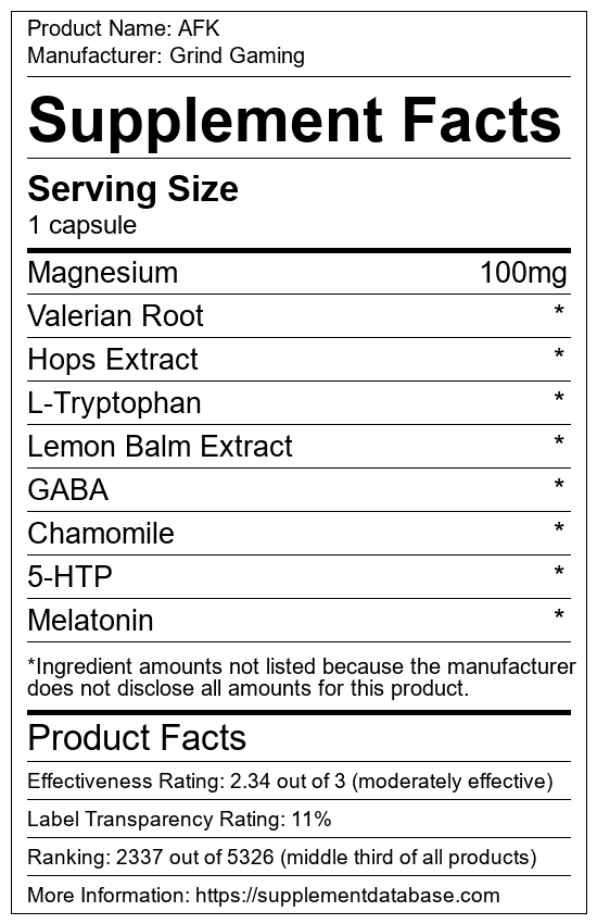 AFK is a sleep aid manufactured by Grind Gaming. It ranks 141 out of 215 sleep aids and earned an overall thumbs-down recommendation based on seven factors including nutrition label transparency, ingredients, dosing, claims, research rating, and ranking.