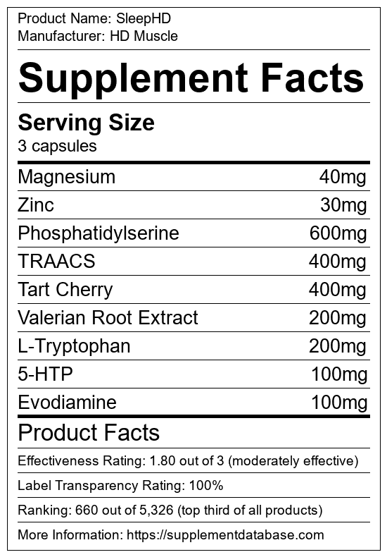 SleepHD is a sleep aid manufactured by HD Muscle. It ranks 52 out of 215 sleep aids and earned an overall thumbs-up recommendation based on seven factors including nutrition label transparency, ingredients, dosing, claims, research rating, and ranking.