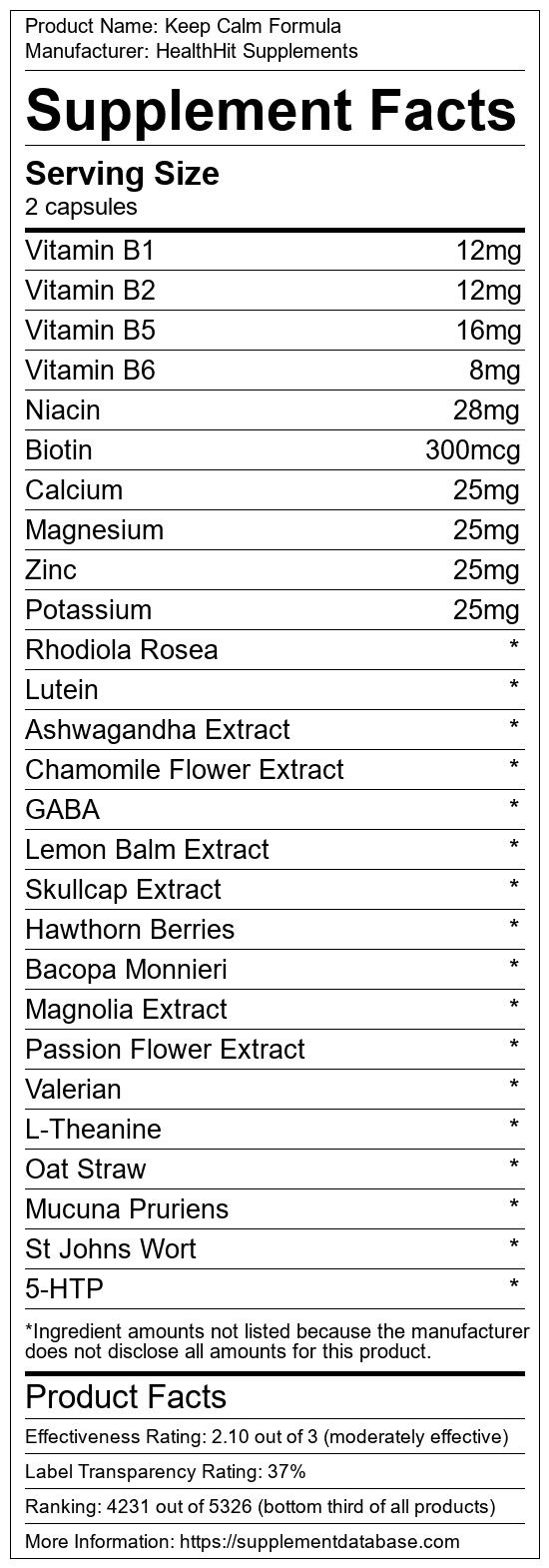 Keep Calm Formula is a mood enhancing supplement manufactured by HealthHit Supplements. It ranks 38 out of 43 mood enhancing supplements and earned an overall thumbs-down recommendation based on seven factors including nutrition label transparency, ingredients, dosing, claims, research rating, and ranking.