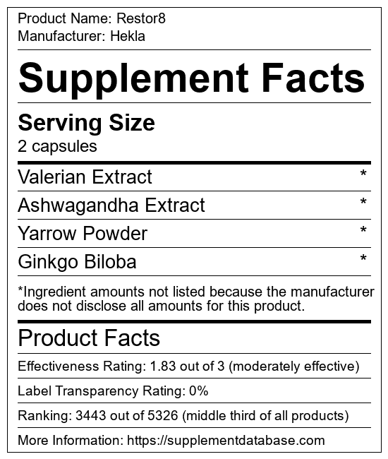 Restor8 is a sleep aid manufactured by Hekla. It ranks 203 out of 215 sleep aids and earned an overall thumbs-down recommendation based on seven factors including nutrition label transparency, ingredients, dosing, claims, research rating, and ranking.