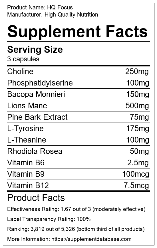 HQ Focus is a cognitive enhancement supplement manufactured by High Quality Nutrition. It ranks 124 out of 173 cognitive enhancement supplements and earned an overall thumbs-down recommendation based on seven factors including nutrition label transparency, ingredients, dosing, claims, research rating, and ranking.
