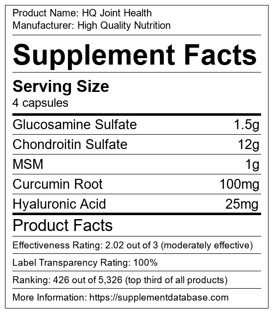 HQ Joint Health is a joint supplement manufactured by High Quality Nutrition. It ranks 14 out of 99 joint supplements and earned an overall thumbs-up recommendation based on seven factors including nutrition label transparency, ingredients, dosing, claims, research rating, and ranking.