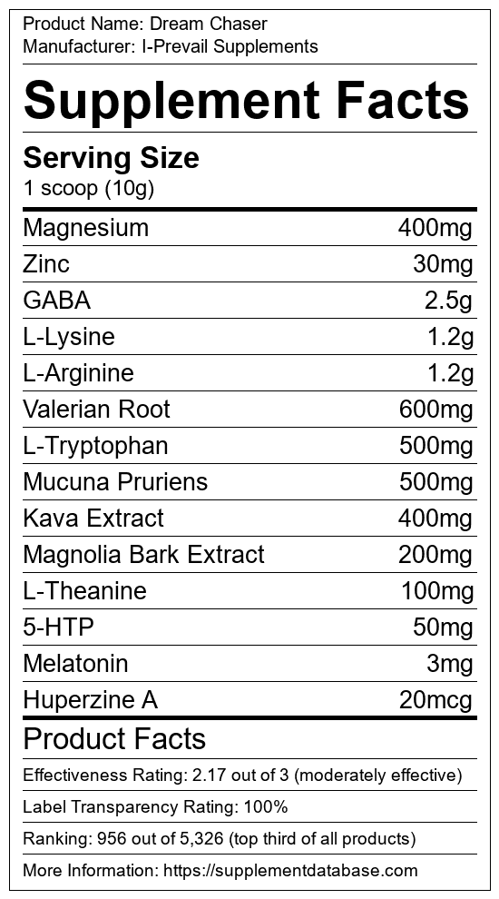 Dream Chaser is a sleep aid manufactured by I-Prevail Supplements. It ranks 87 out of 215 sleep aids and earned an overall thumbs-up recommendation based on seven factors including nutrition label transparency, ingredients, dosing, claims, research rating, and ranking.