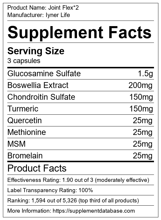 Joint Flex is a joint supplement manufactured by Iyner Life. It ranks 35 out of 99 joint supplements and earned an overall thumbs-up recommendation based on seven factors including nutrition label transparency, ingredients, dosing, claims, research rating, and ranking.