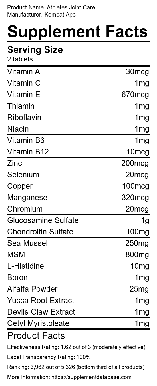 Athletes Joint Care is a joint supplement manufactured by Kombat Ape. It ranks 92 out of 99 joint supplements and earned an overall thumbs-down recommendation based on seven factors including nutrition label transparency, ingredients, dosing, claims, research rating, and ranking.