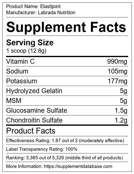 Elastijoint is a joint supplement manufactured by Labrada Nutrition. It ranks 73 out of 99 joint supplements and earned an overall thumbs-down recommendation based on seven factors including nutrition label transparency, ingredients, dosing, claims, research rating, and ranking.