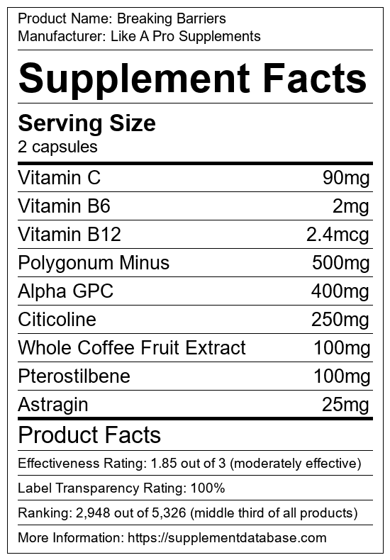 Breaking Barriers is a cognitive enhancement supplement manufactured by Like A Pro Supplements. It ranks 93 out of 173 cognitive enhancement supplements and earned an overall thumbs-down recommendation based on seven factors including nutrition label transparency, ingredients, dosing, claims, research rating, and ranking.