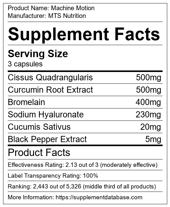 Machine Motion is a joint supplement manufactured by MTS Nutrition. It ranks 53 out of 99 joint supplements and earned an overall thumbs-down recommendation based on seven factors including nutrition label transparency, ingredients, dosing, claims, research rating, and ranking.