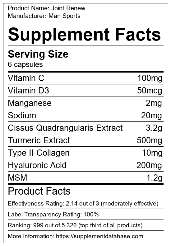 Joint Renew is a joint supplement manufactured by Man Sports. It ranks 28 out of 99 joint supplements and earned an overall thumbs-up recommendation based on seven factors including nutrition label transparency, ingredients, dosing, claims, research rating, and ranking.