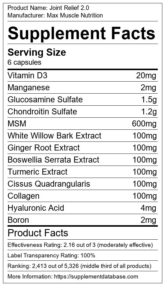 Joint Relief 2.0 is a joint supplement manufactured by Max Muscle Nutrition. It ranks 51 out of 99 joint supplements and earned an overall thumbs-down recommendation based on seven factors including nutrition label transparency, ingredients, dosing, claims, research rating, and ranking.